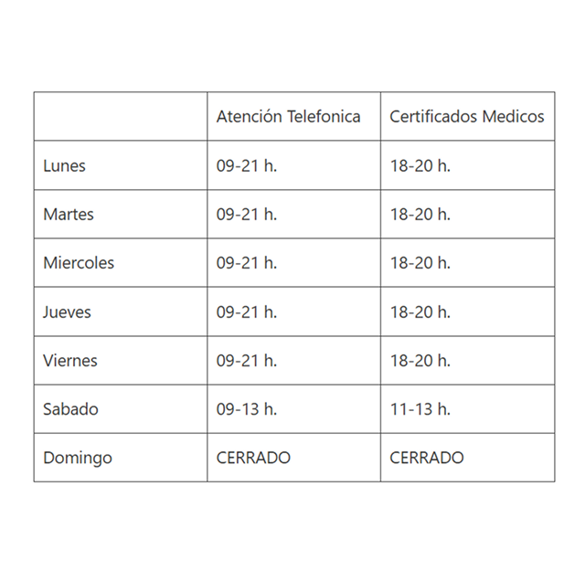Una vez resueltas las dudas para venir al centro médico a realizarse un certificado médico o la renovación de su carnet de conducir, tenemos el segundo horario, donde le atenderemos por la tarde de lunes a viernes y los sábados por la mañana.